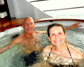 After nothing but perfect weather the sky got unexpectedly cloudy, and the crew decided the water was too choppy for the first afternoon excursion of more snorkeling. We chose to forego the hike scheduled afterwards in favor of sitting in the Jacuzzi and relaxing in our room with a bottle of wine.